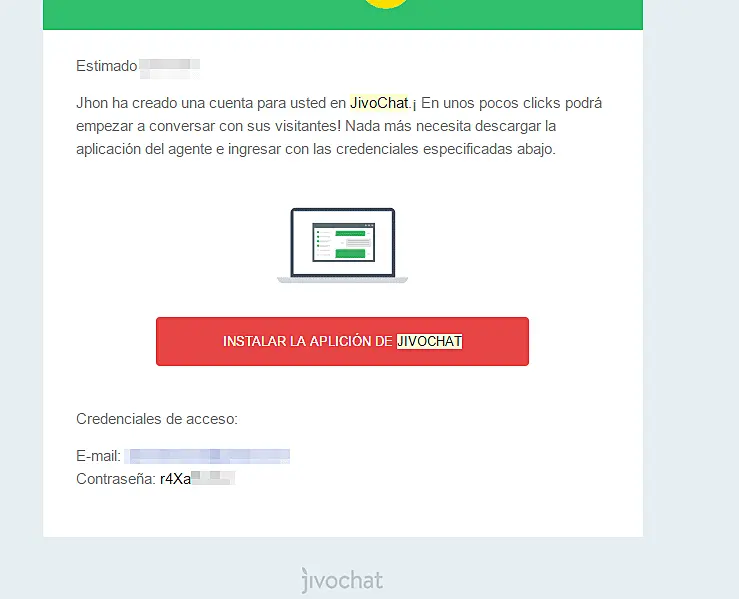Si usted se registró en nuestro sitio web e instaló el chat, use el mismo correo electrónico y contraseña de JivoChat. Si el que está registrado, lo añade a usted como un agente debería recibir un correo electrónico como el siguiente con los datos de usuario y contraseña: