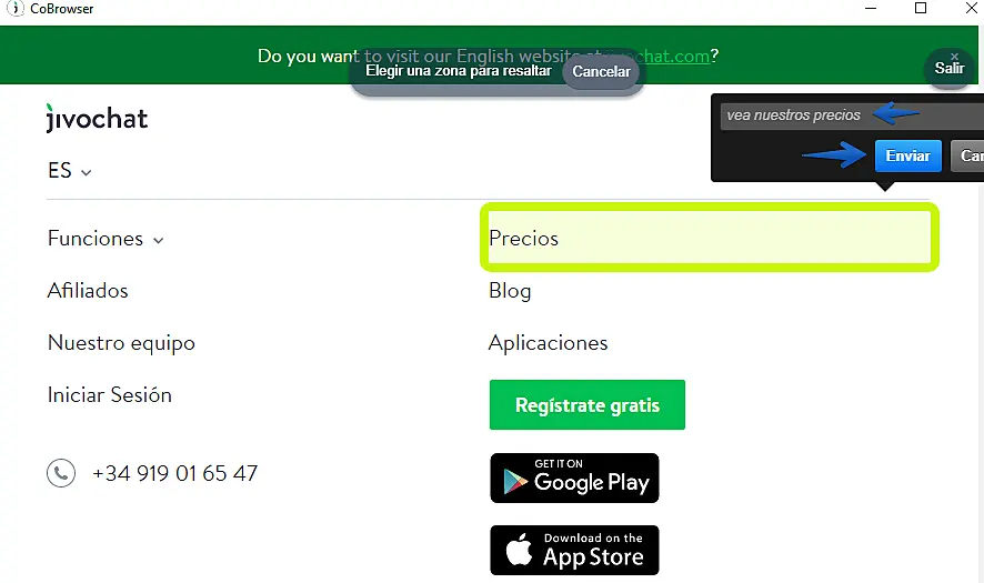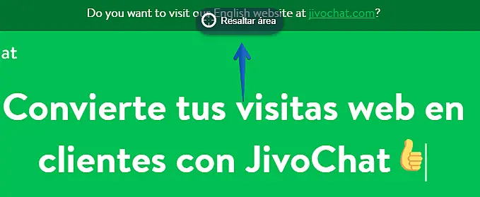 Puntero: Esta característica le permite resaltar un elemento en su sitio web y enviarlo al visitante. Una nueva ventana aparecerá al pulsar el botón de "puntero". En esta ventana, se cargará la página actual del visitante.