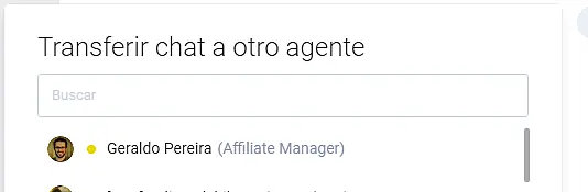 3. Transferir chat: Puede transferir un chat a su compañero de otro departamento. Para ello pulse sobre el botón "Transferir chat" y seleccionar un agente.