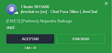 Cuando un visitante envía un mensaje de respuesta, verá una notificación de solicitud de chat en la esquina inferior derecha de la pantalla: