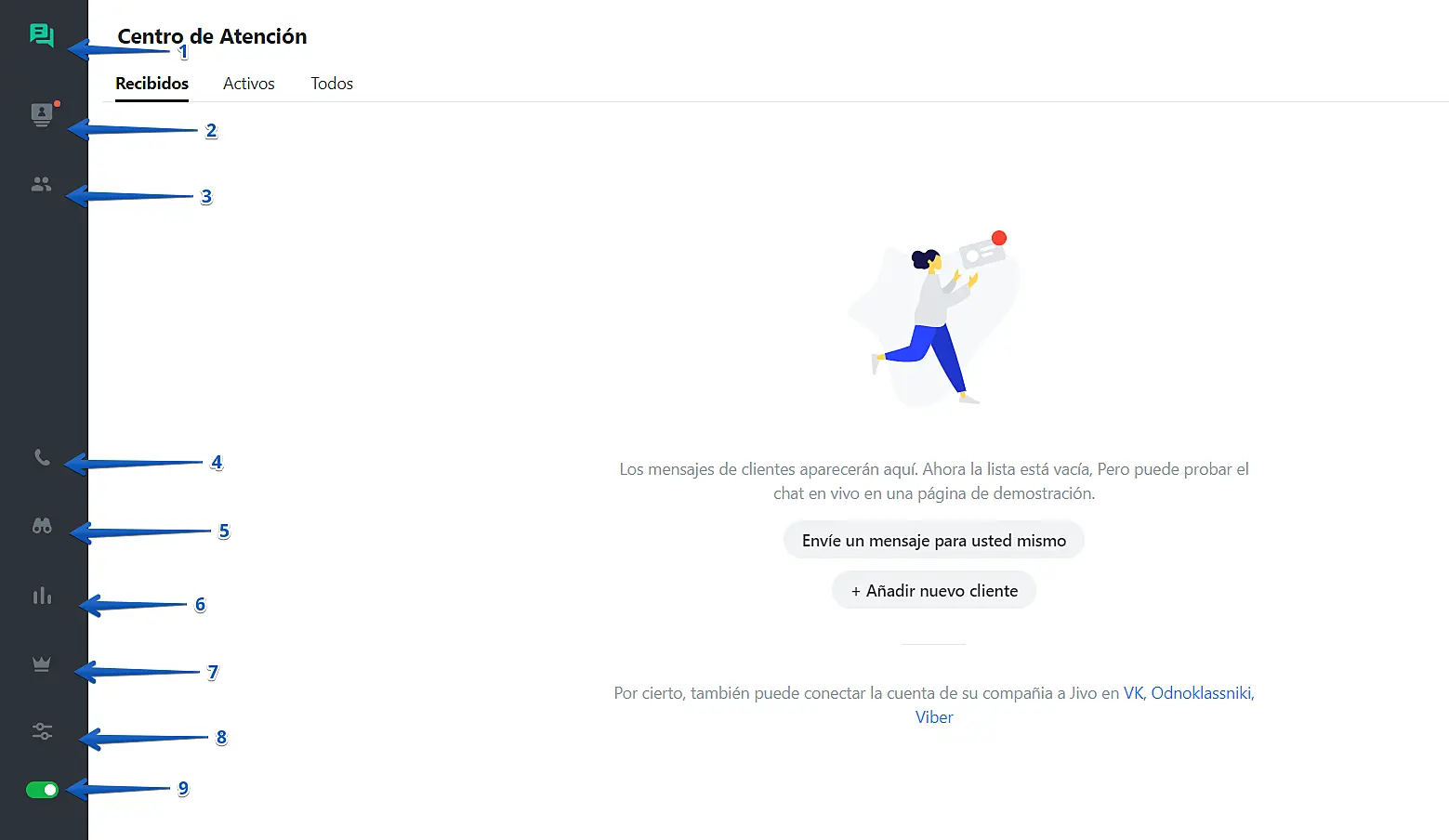 1. Centro de Atención: Todos los chats entrantes aparecerán en esta pestaña. Vea el siguiente tutorial para mayor información: link