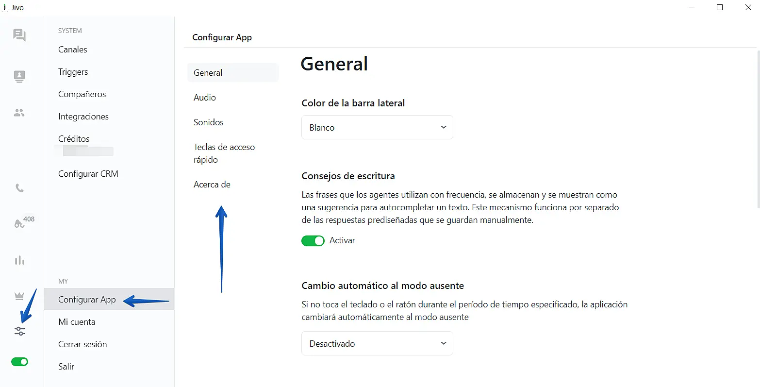 8. Ajustes: Configure su cuenta de JivoChat y también la aplicación