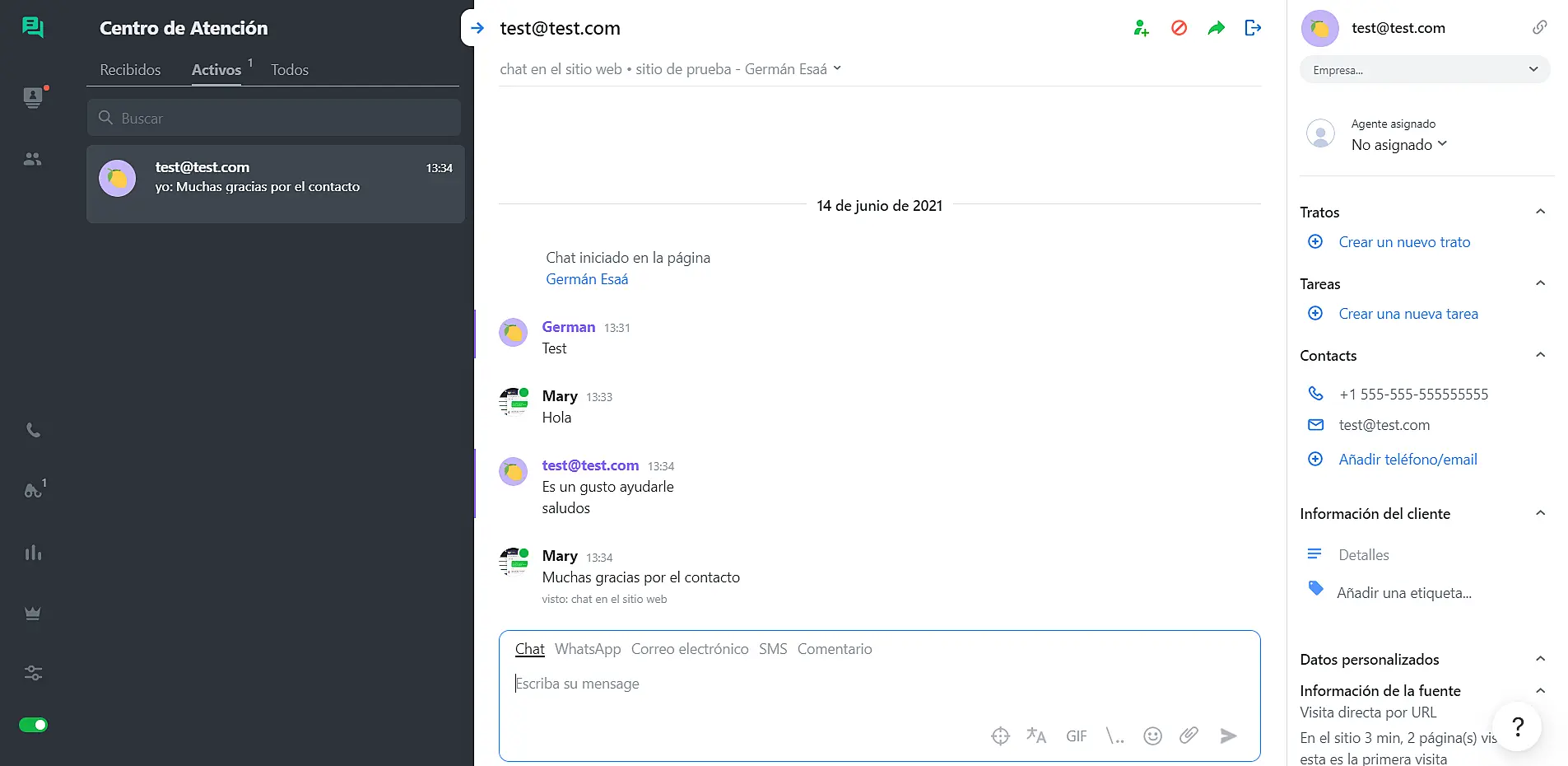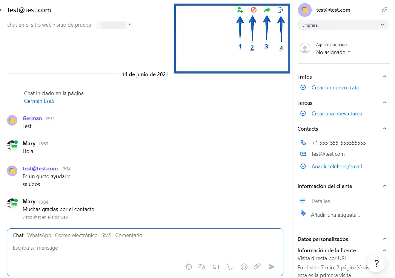 WhatsApp: En caso de tener WhatsApp conectado (para mayor información vea este link) puede continuar la conversación con el cliente vía WhatsApp