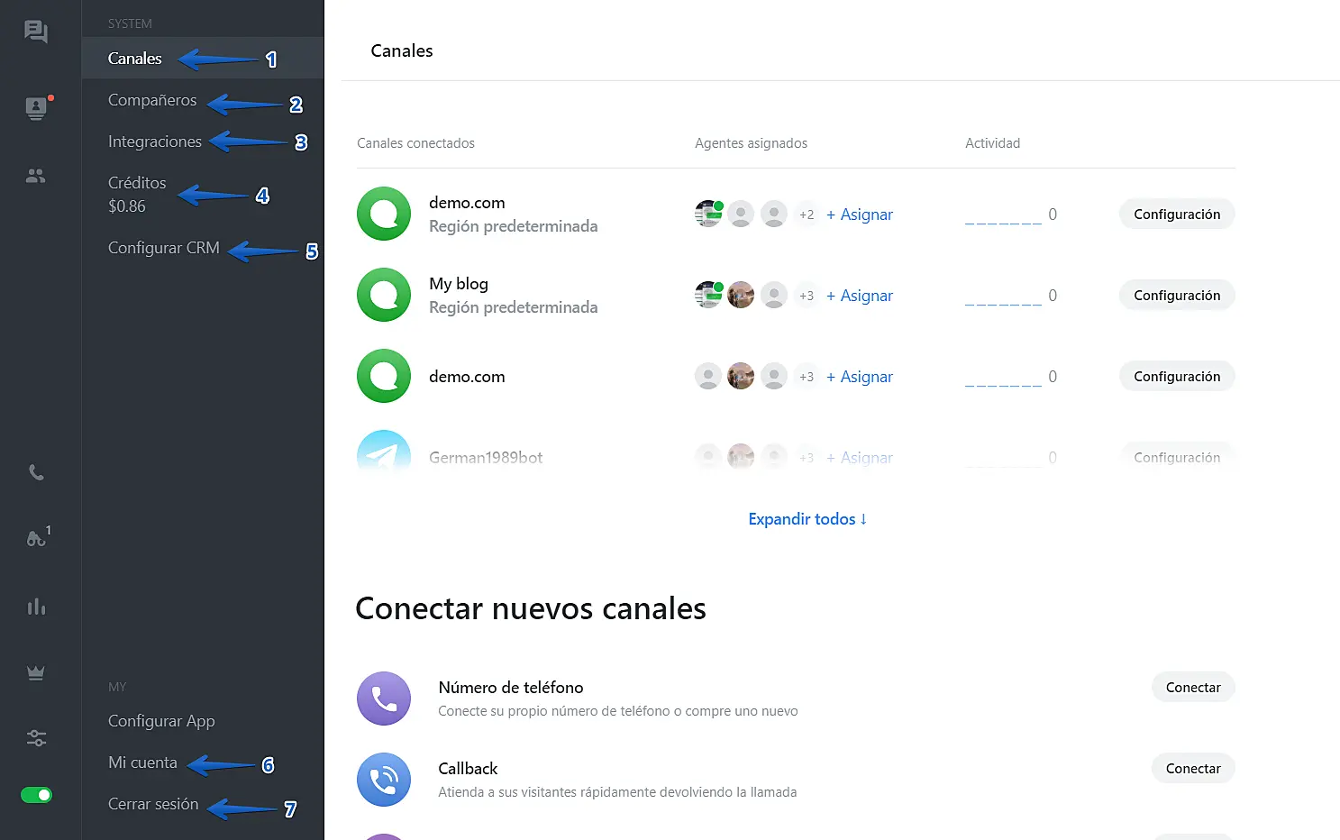 1. Canales: Podrá añadir nuevos canales a su cuenta o nuevos sitios web.