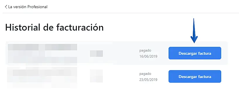 Ahora verá una lista con las facturas disponibles para descarga de sus últimos pagos, haga clic en el botón azul "descargar factura".