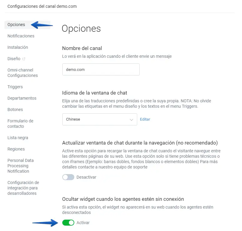 Ahora vaya al menu "Opciones" y active la opción Ocultar widget cuando los agentes estén sin conexión