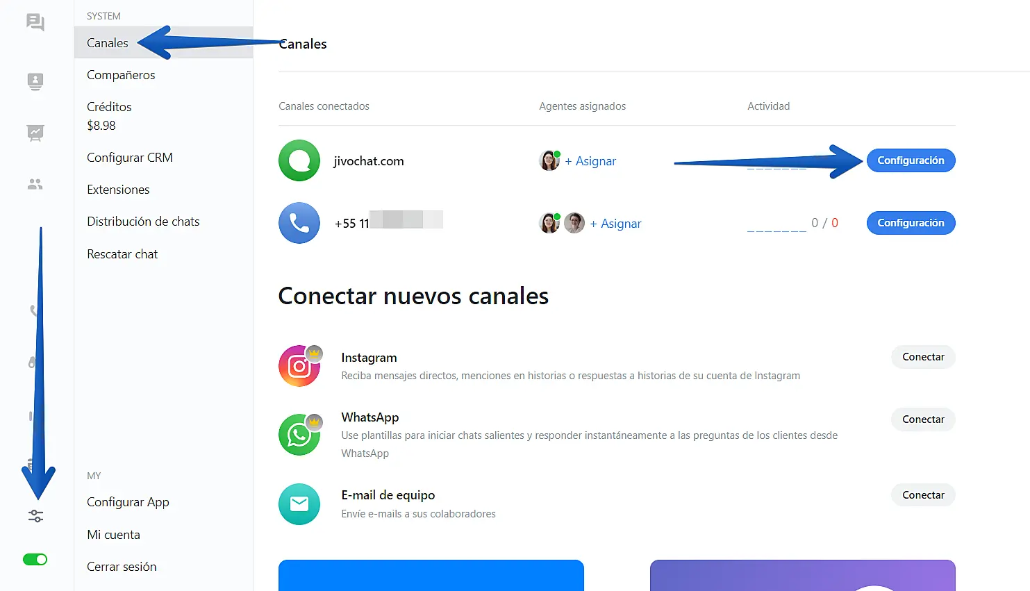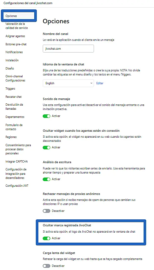 Para desactivar el logo de JivoChat en el widget, por favor vaya a "Ajustes"->"Canales"->"Configuraciones" (al lado derecho del nombre de su sitio web)