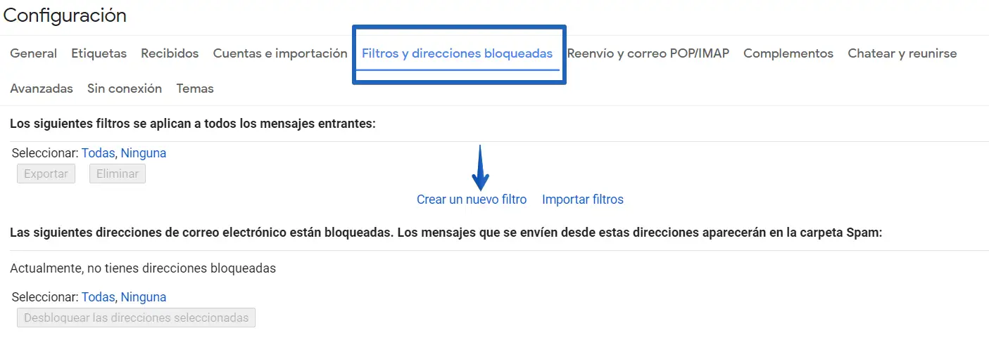 En Gmail vaya a la "configuración" > "ver toda la configuración" > "filtros y direcciones bloqueadas" y haga clic en "crear un nuevo filtro".
