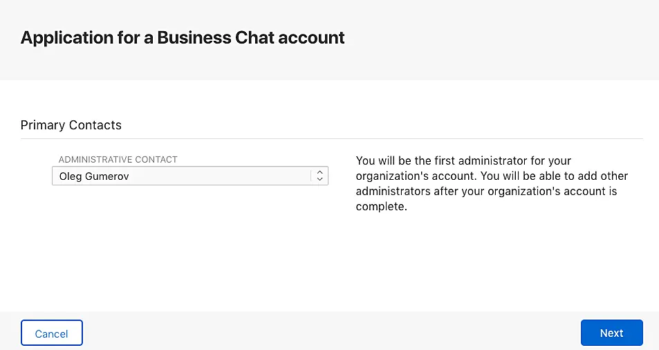 Luego debe configurar el contacto del administrador de la cuenta. Este usuario podrá realizar cambios en la cuenta de la organización y añadir nuevos usuarios. Por defecto, este campo contiene el Apple ID del usuario que se está registrando.