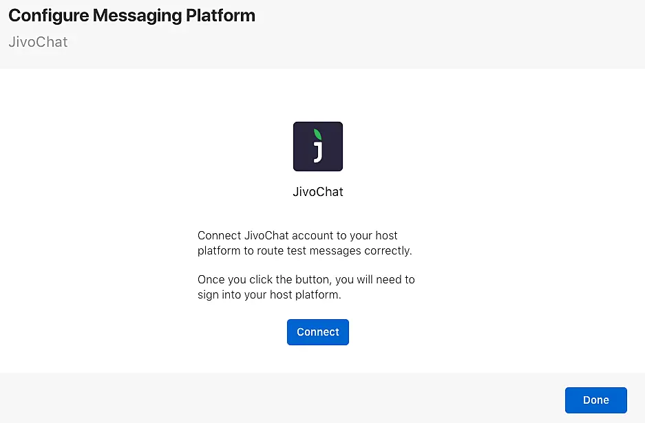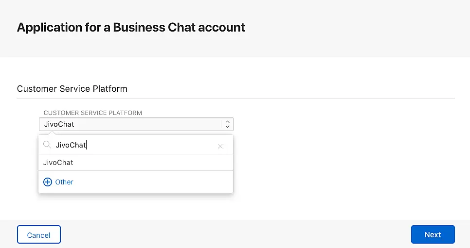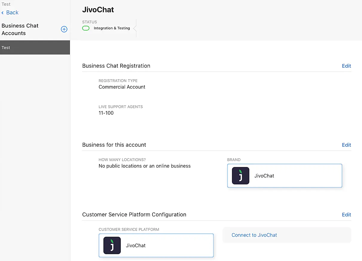 En este punto, podrá conectar JivoChat. Abra las configuraciones de su cuenta de Business Chat -> en la sección de "Customer Service Platform Configuration" -> clic en "Connect to JivoChat".