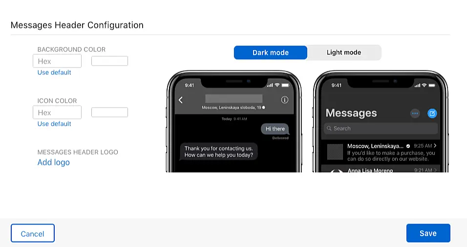 Ahora, en el campo "Messages Header Configuration", configure los colores para el encabezado del chat, los botones de navegación en el chat ("Info" y "Back") y cargue sus logos.