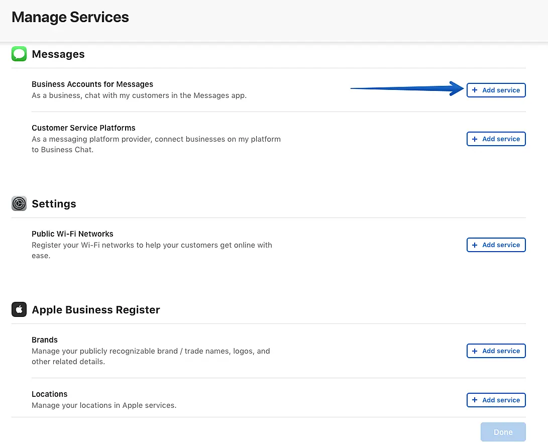 En la siguiente pantalla, debe buscar una cuenta de Business para mensajes en la lista de servicios y haga clic en "Add service".