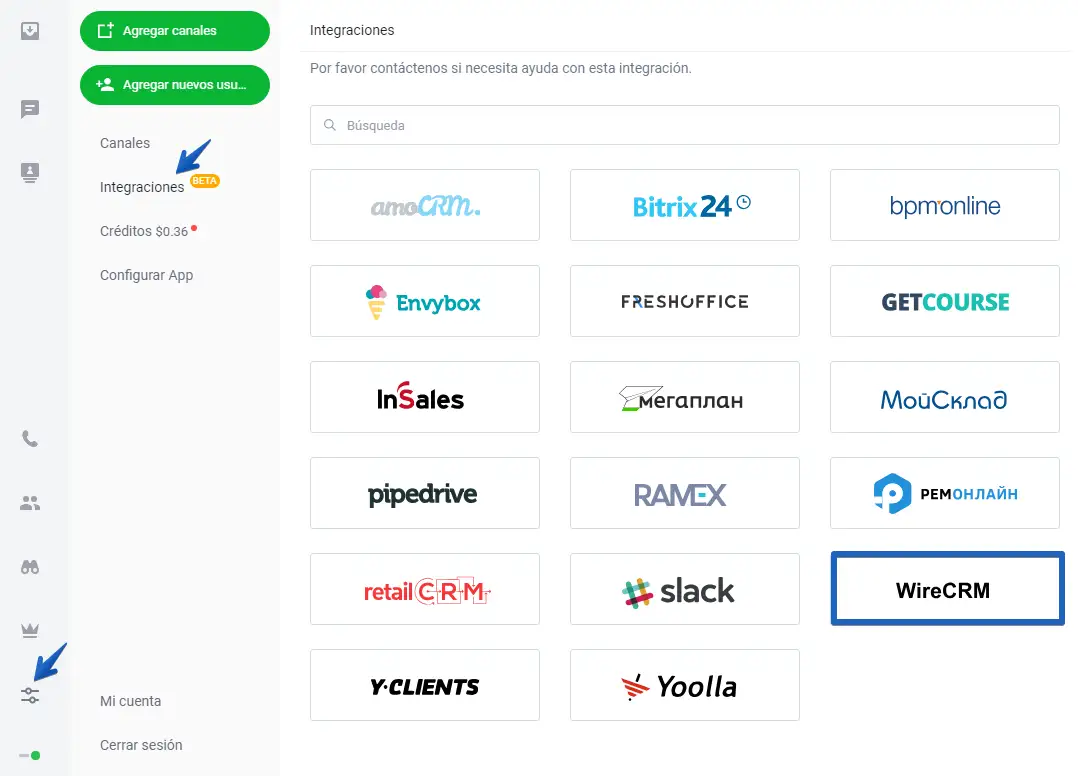 Para integrar con WireCRM, abra su Aplicación del agente y vaya a "Ajustes"-> "Integraciones" y haga clic en WireCRM.