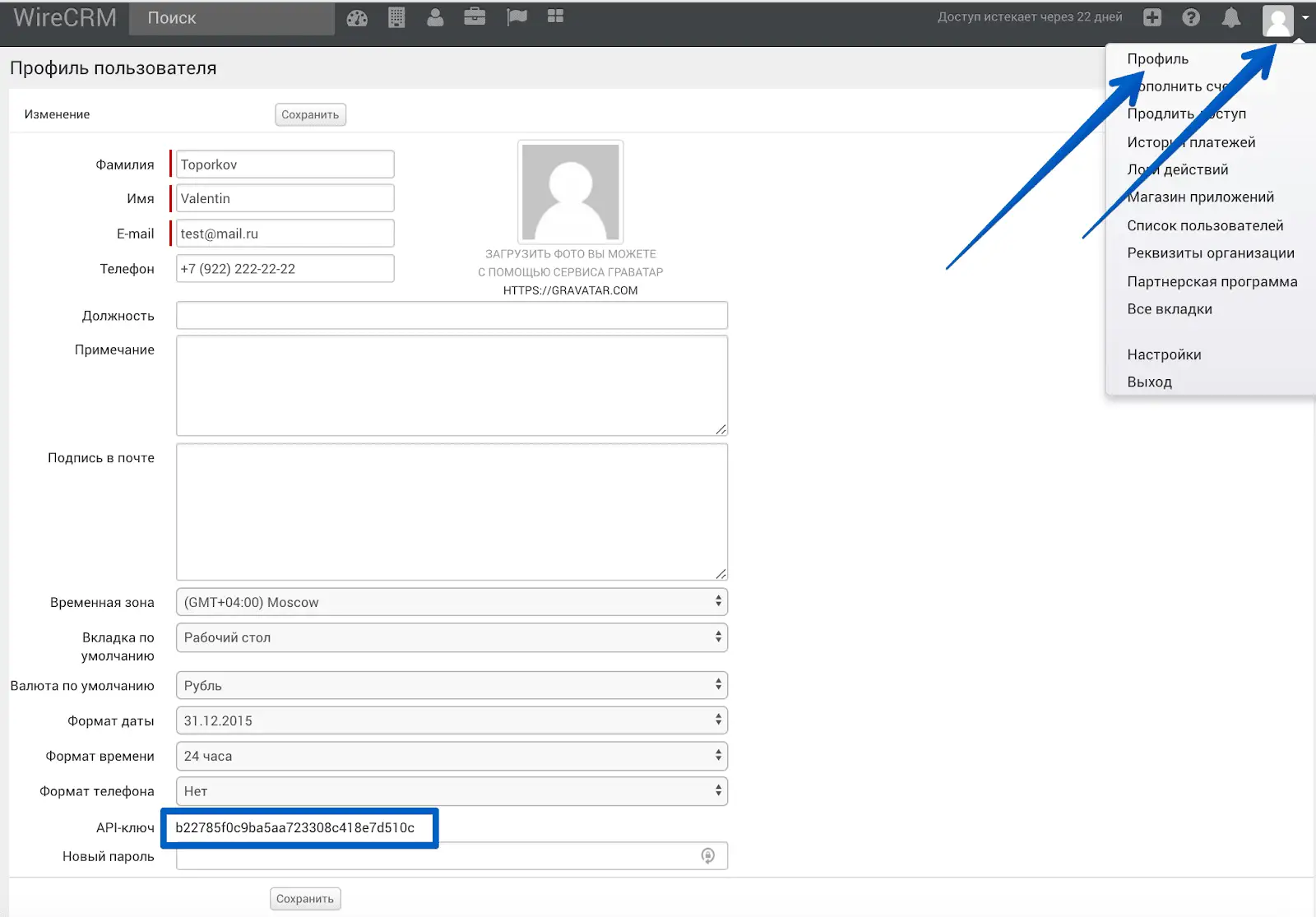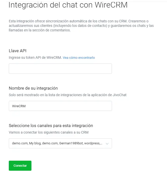 1.Llave API: Puede encontrar esta llave en las configuraciones de su WireCRM. Haga clic en el icono de la esquina superior derecha y va a "Profile", copie la llave API para pegarla en el campo requerido por JivoChat.