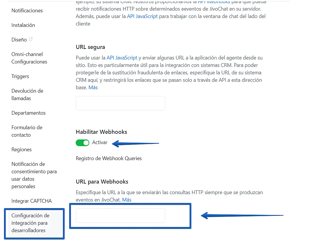 - En este menú debe localizar las configuraciones para desarrollador. Asegúrese de habilitar los Webhooks cómo en la imagen y pegue su API de DataCRM en el espacio en blanco: