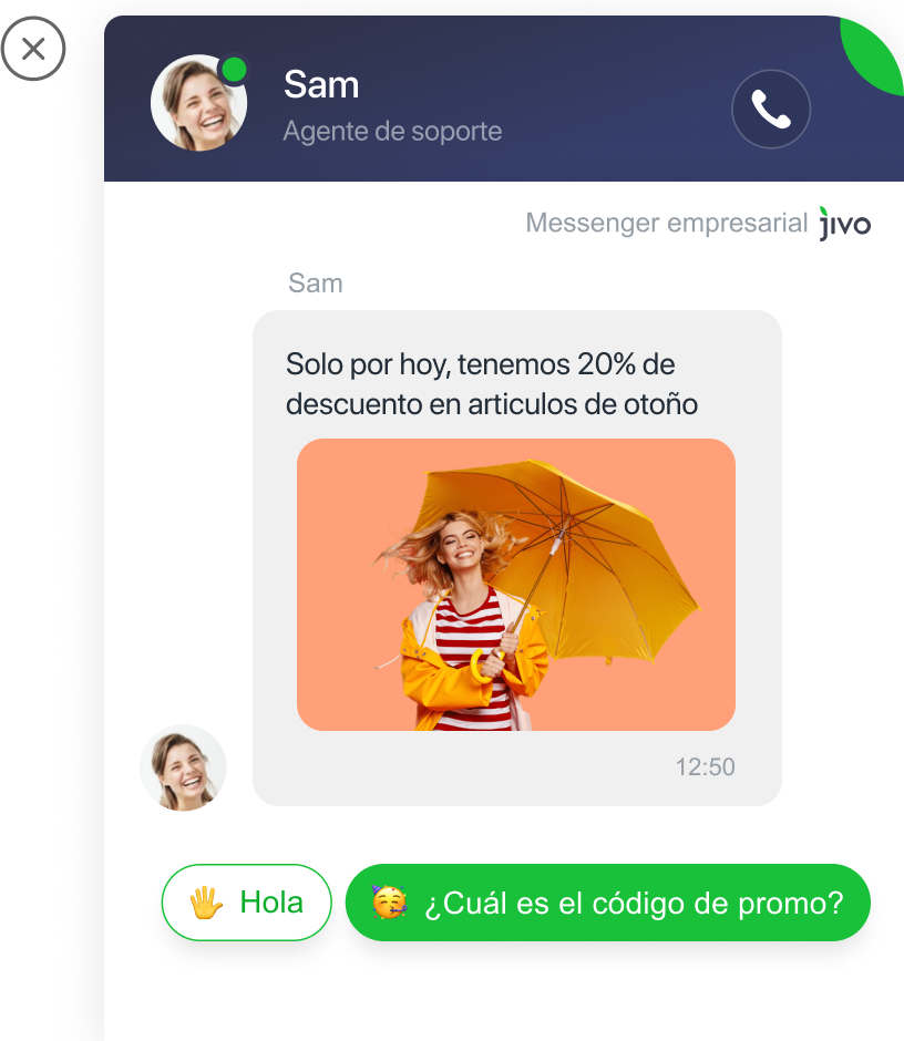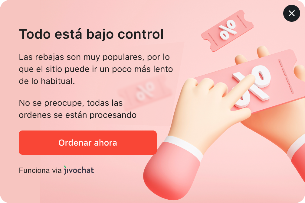 ¿Tiene promociones en curso que necesitan más atención? Añadir información sobre las promociones actuales en la sección de su sitio web puede no ser suficiente. Configure una ventana emergente en las páginas seleccionadas para que más visitantes conozcan las ofertas actuales. Comparta códigos promocionales con los visitantes seleccionados directamente en el chat mediante campañas de chat