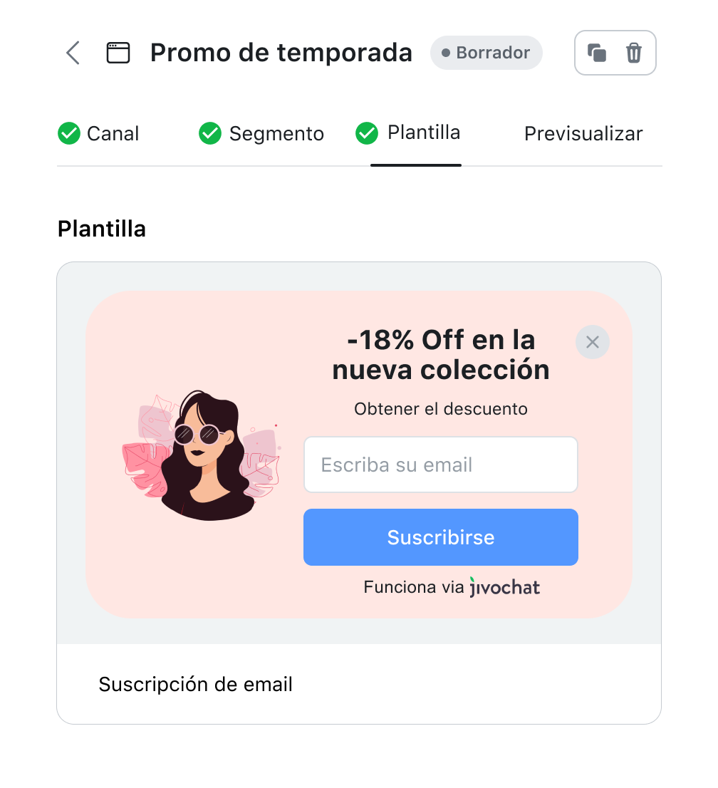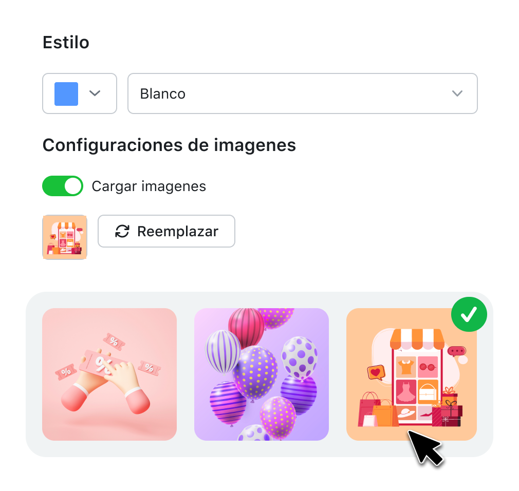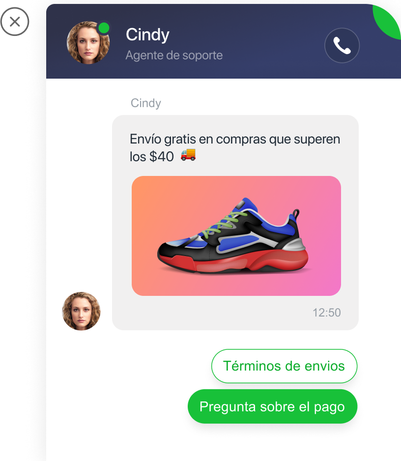 Configure ventanas emergentes que se adapten a su estilo y diseño con temas de color y opciones de imagen. Añada imágenes y emojis a las campañas de chat para que sus ofertas sean imposibles de pasar por alto.